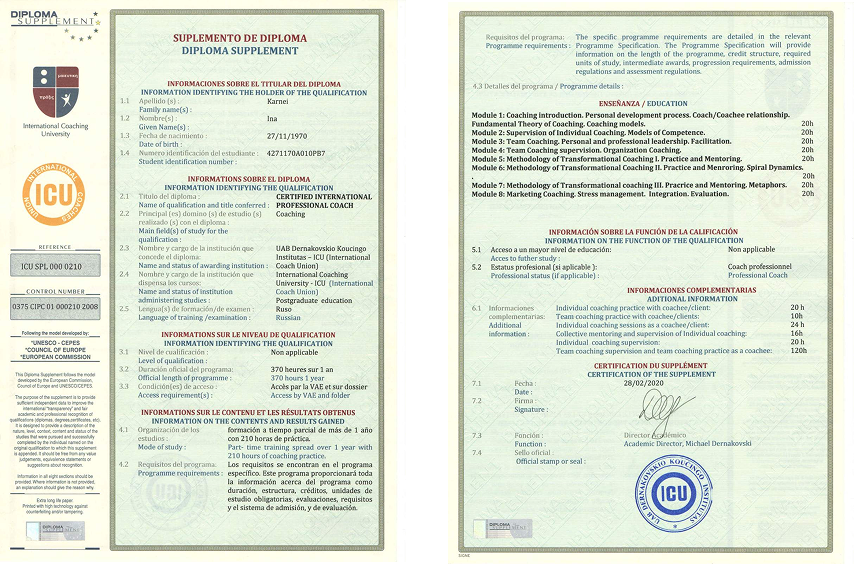 При выполнении дополнительных условий кроме международного сертификата слушатель может получить Диплом государственного образца о переподготовке «Профессиональный коуч»